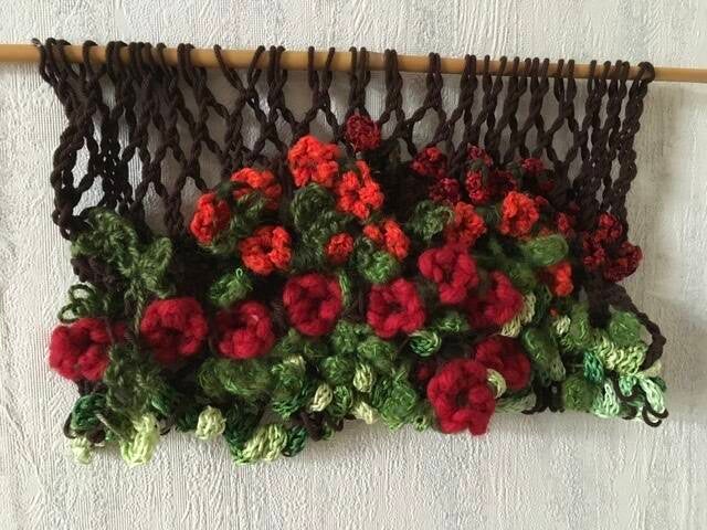 Op het Textielfestival Weerribben kreeg ik een aantal malen de vraag of ik ook les gaf in sprang. Dat had ik tot dan toe nog niet gedaan. Maar na het Textielfestival ben ik er wel mee begonnen. Ik heb inmiddels twee workshops ontwikkeld. Eentje voor beginners ‘kennismaken met sprang’ en een vervolgworkshop daarop, waarbij ik uitleg hoe je een bloementafereeltje als op bovenstaande foto kunt maken. Dit is een combinatie van sprang met andere technieken (naar keuze, ik geef verschillende mogelijkheden).