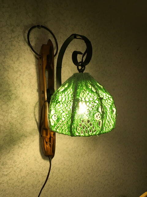 Ik heb een heel aantal lampenkappen bekleed met sprang, meestal met een accentje in andere technieken zoals haken en naaldkant. De meeste van deze lampenkappen hebben een plaatsje gekregen in mijn Vertelmuseum De Vlechtvogel.